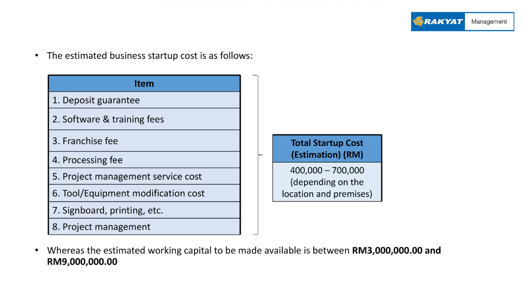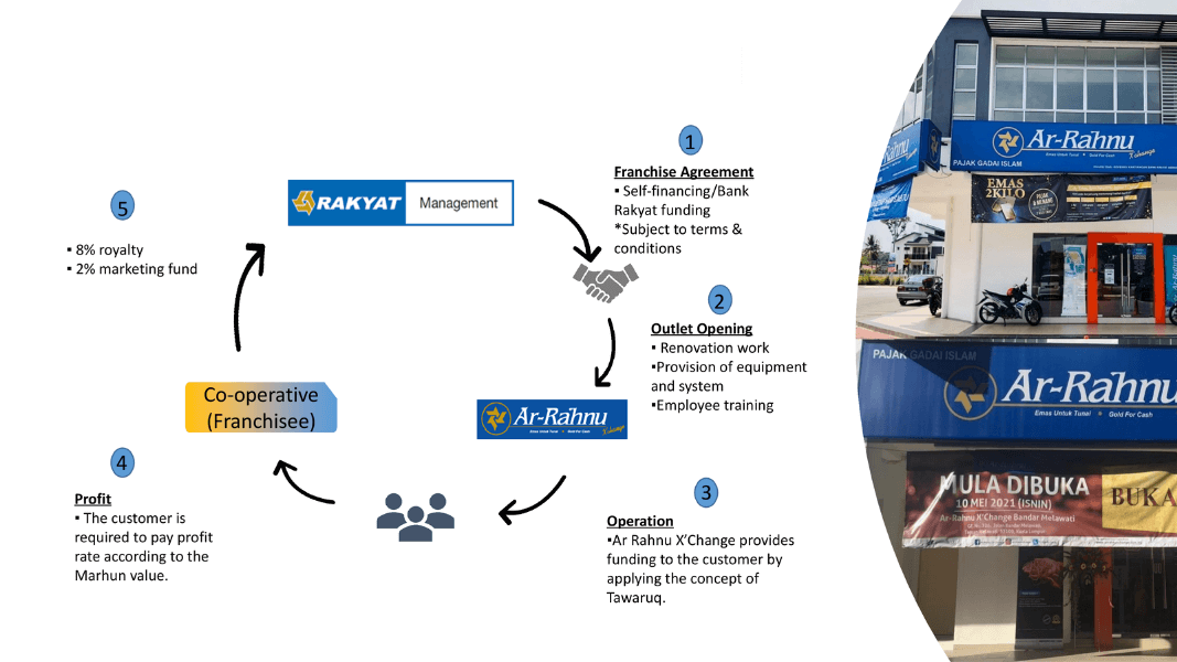 RMS assists in facilitating licensing and business opportunities for growing co-operatives. This process entails the co-operative’s involvement, where we collect important data on the business and demographics. Following mutual agreement, RMS then enters into an Ar-Rahnu business agreement with the co-operative. Apart from self-financing, the co-operative also has the option of procuring funds through Bank Rakyat financing. As part of this agreement, the co-operative must obtain the standard equipment from RMS and use the Ar-Rahnu X'Change system provided. Upon commencement of the co-operative's operation, payment of royalty of 10% and marketing fund of 2% shall be imposed on sales generated. This framework ensures the partnership is well-organised and mutually beneficial to both RMS and co-operative.